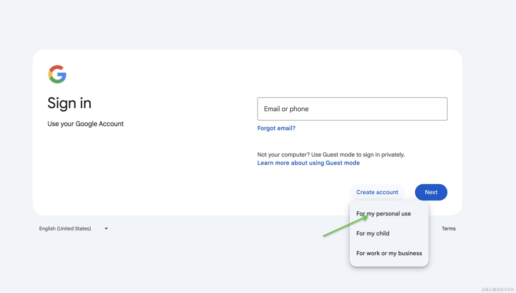 - 访问Google搜索页面,点击右上角的**“登录”按钮,在登录页面选择“创建账号”**(选择个人使用即可)。